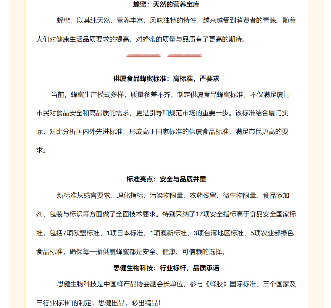 快訊:供廈標(biāo)準(zhǔn)《供廈食品 蜂蜜》 2024-9-30發(fā)布實(shí)施 思健生物科技很榮幸參與該標(biāo)準(zhǔn)制定